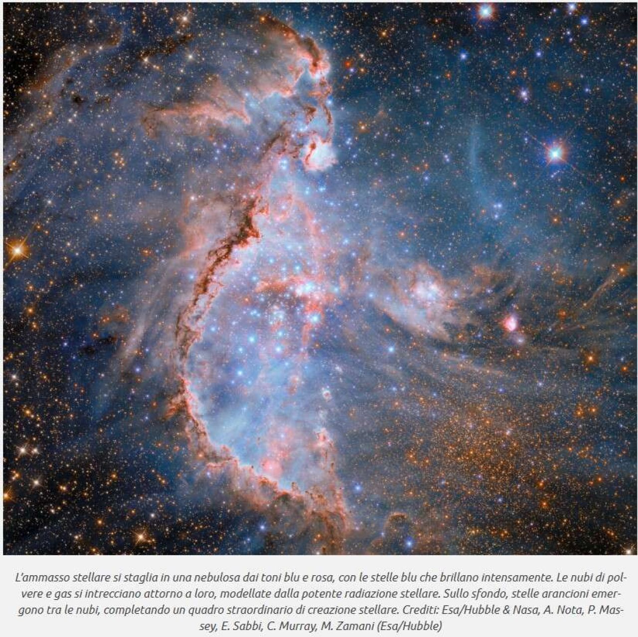 Le stelle più massicce agiscono come scultori cosmici, modellando l’ambiente circostante con le loro radiazioni e i venti stellari estremamente violenti. Questi venti comprimono, riscaldano e disperdono il gas, dando origine a una gigantesca bolla in espansione, visibile nell’immagine come un alone rosato che avvolge il cuore dell’ammasso.