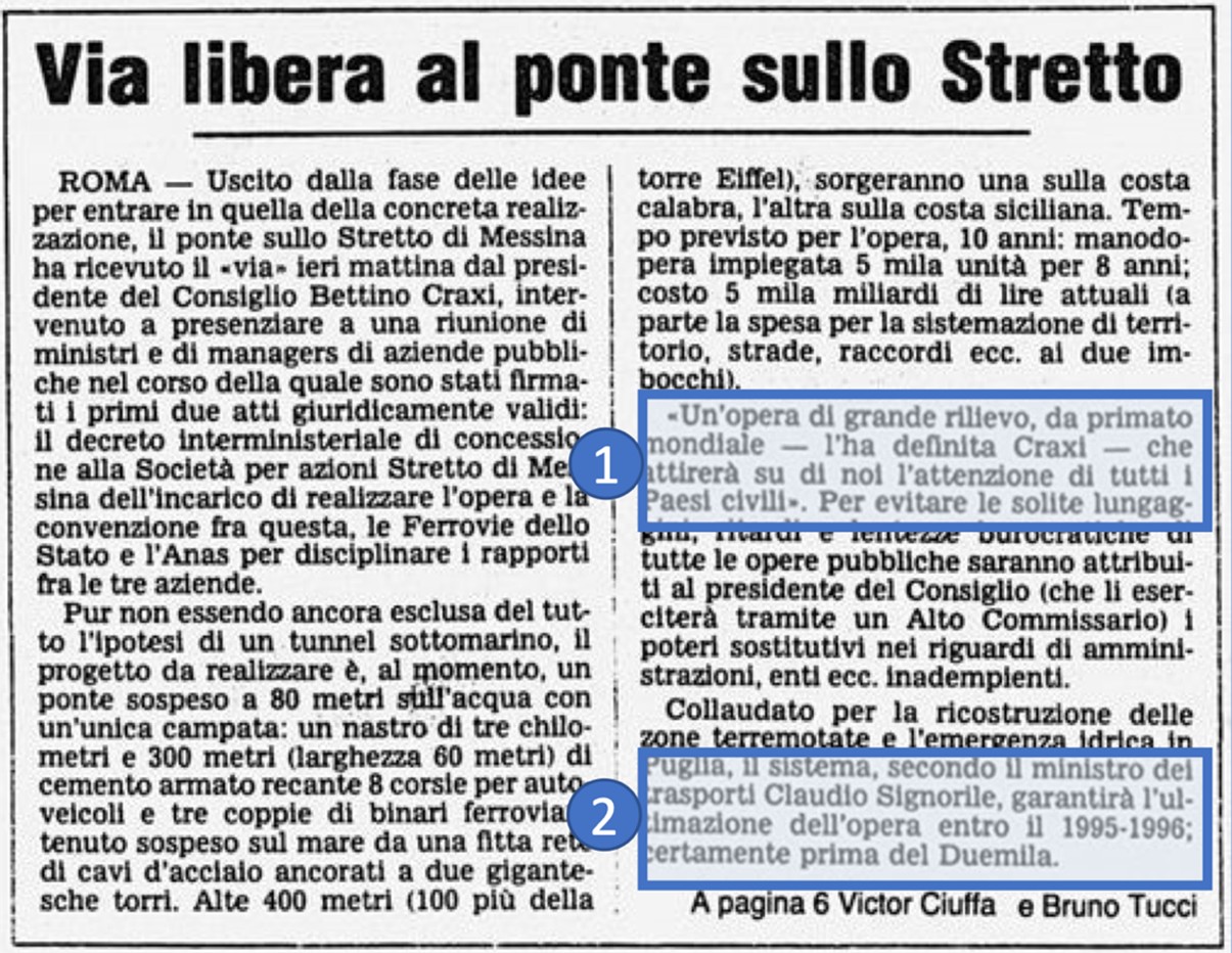 Anche il Presidente del Consiglio Bettino Craxi, il 27 dicembre del 1985, augurando il buon anno può annunciare agli italiani, intervistato da Repubblica, che il Ponte sarà fatto con questo cronoprogramma: “…entro il 1986 chiuderemo la fase progettuale. Con il 1987 porteremo avanti le opere di fondazione e la sistemazione del territorio secondo quanto predisposto dai tecnici del progetto, mentre alla fine dell’88 ci sarà l’apertura dei cantieri, i quali resteranno operanti per otto, dieci anni”.