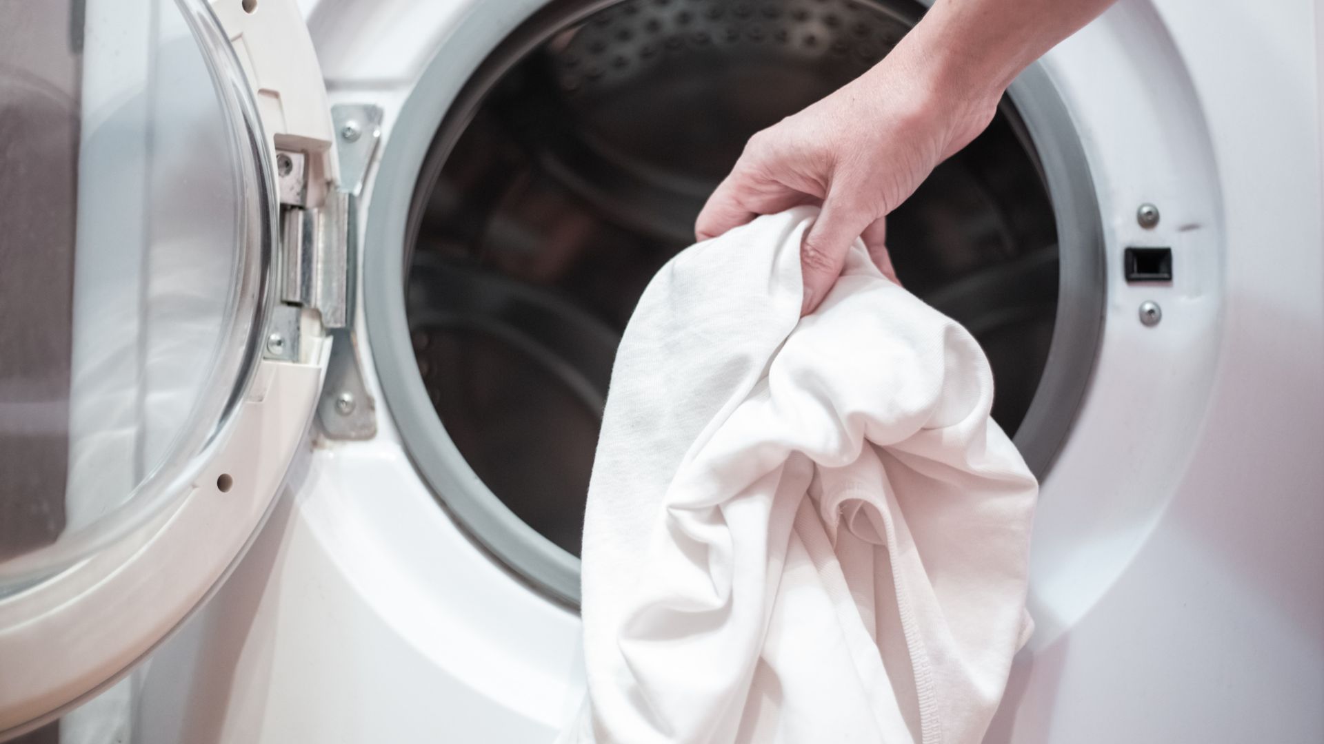 Testo lato sinistro: Lavare i vestiti troppo spesso contribuisce all'inquinamento ambientale. Ogni ciclo di lavaggio consuma acqua ed energia, rilasciando microfibre sintetiche che finiscono nei corsi d'acqua, danneggiando gli ecosistemi acquatici.
