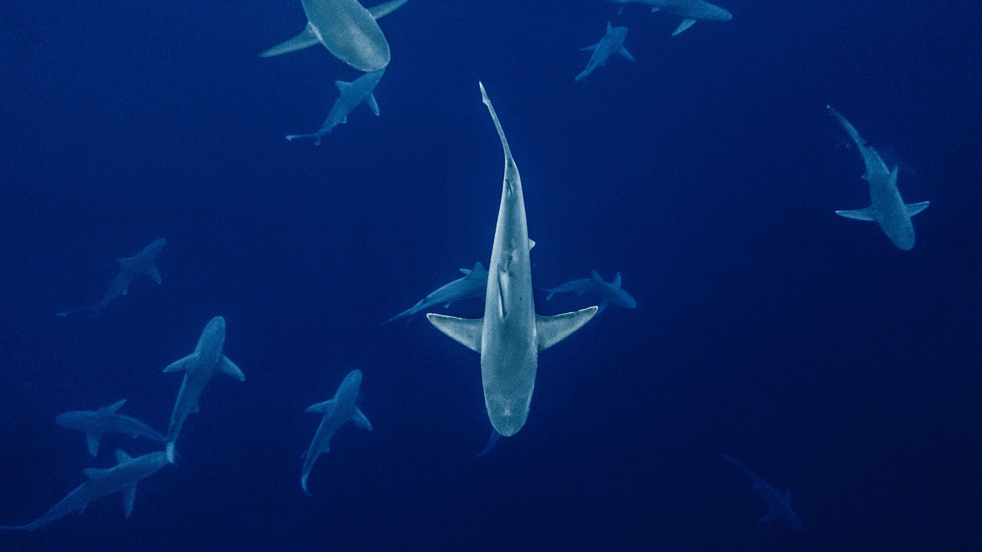 Testo lato sinistro: Le montagne sottomarine ospitano fino a 41 volte più squali rispetto alle acque aperte. Questi ecosistemi sommersi offrono riparo e risorse essenziali, rendendoli cruciali per la biodiversità marina e la conservazione delle specie.