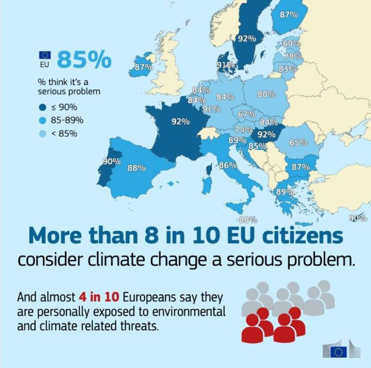 L’86% degli italiani e l’85% dei cittadini Ue ritiene che oggi il cambiamento climatico sia un serio problema; per l’88% degli italiani (e 85% in Ue) affrontarlo è una priorità per migliorare la salute pubblica e la qualità di vita; l’85% (77%) si rende conto che i costi provocati dalla crisi climatica sono già «molto più alti» degli investimenti necessari alla transizione ecologica; l’88% (77%) ritiene che lottare contro la crisi climatica porta a innovazioni in grado di rendere le imprese europee più competitive e dunque che queste imprese dovrebbero (89% vs 84%) dovrebbero ricevere maggior supporto per competere sui mercati globali delle tecnologie pulite.