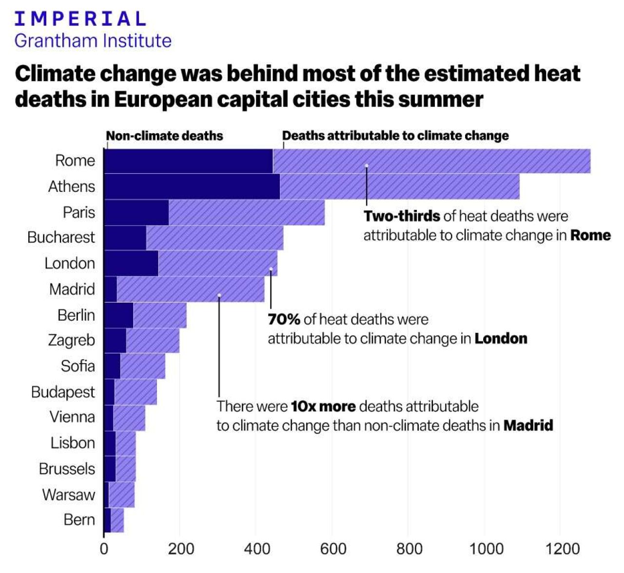 Secondo le stime dei ricercatori, i cambiamenti climatici sono all'origine di 4.597 morti per il caldo stimate in Italia, 2.841 in Spagna, 1.477 in Germania, 1.444 in Francia, 1.147 nel Regno Unito, 1.064 in Romania, 808 in Grecia, 552 in Bulgaria e 268 in Croazia. Guardando alle capitali, invece, i cambiamenti climatici hanno causato 835 morti per il caldo a Roma, 630 ad Atene, 409 a Parigi, 387 a Madrid, 360 a Bucarest, 315 a Londra e 140 a Berlino. In particolare, le persone di età pari o superiore a 65 anni hanno rappresentato l'85% dei decessi in eccesso, evidenziando come le estati più calde diventeranno sempre più letali per la popolazione europea che invecchia.