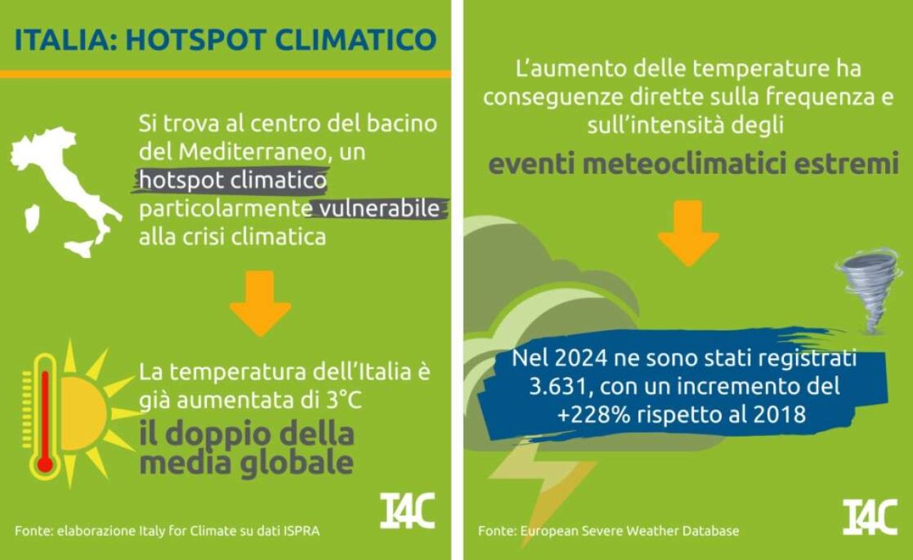 «Com’è noto – argomentano nel merito da Italy for climate – l’aumento delle temperature ha conseguenze dirette sulla frequenza e sull’intensità degli eventi meteoclimatici estremi. Nel 2024 ne sono stati registrati 3.631, con un incremento del +228% rispetto al 2018. Crescono soprattutto le piogge intense (+452%), le raffiche di vento (+183%), le grandinate (+145%) e i tornado (+76%). Dal 1980 a oggi, l’Italia ha subito oltre 90 miliardi di euro di danni (un decimo di tutta la spesa pubblica nazionale), risultando il terzo Paese europeo più colpito dopo Germania e Francia. Ma, oltre all’aumento delle temperature, l’altra grande sfida per l’Italia nell’epoca dei cambiamenti climatici è la gestione della risorsa idrica. Dall’inizio del Novecento la disponibilità di acqua si è ridotta del 20% (rispetto al 1921-1950, ndr) e le stime indicano che potrebbe diminuire di un ulteriore 10% con un aumento delle temperature globali di +2°C, e addirittura del 40% nello scenario attuale di +3-4°C entro fine secolo».