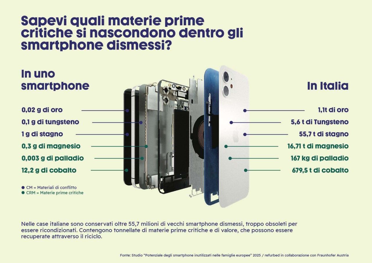 Per non andare troppo lontano comincerò a dire che almeno un paio di vecchi smartphone anche io li ho messi nel cassetto. Quando sono passato al modello nuovo o superiore non mi hanno offerto niente per quello vecchio che così è finito in un cassetto. Ora scopro, grazie a uno studio condotto da Fraunhofer Austria per conto di refurbed che nascondo un piccolo tesoro e con me gli abitanti di gran parte del mondo. In Europa ci sono circa 642 milioni di apparecchi inutilizzati, di questi un terzo potrebbe ricondizionato ma anche dagli altri si potrebbero estrarre materie prime per oltre un miliardo di euro. Solo in Italia gli apparecchi riciclabili sono oltre 55 milioni ma ben 26 milioni sono addirittura riciclabili.