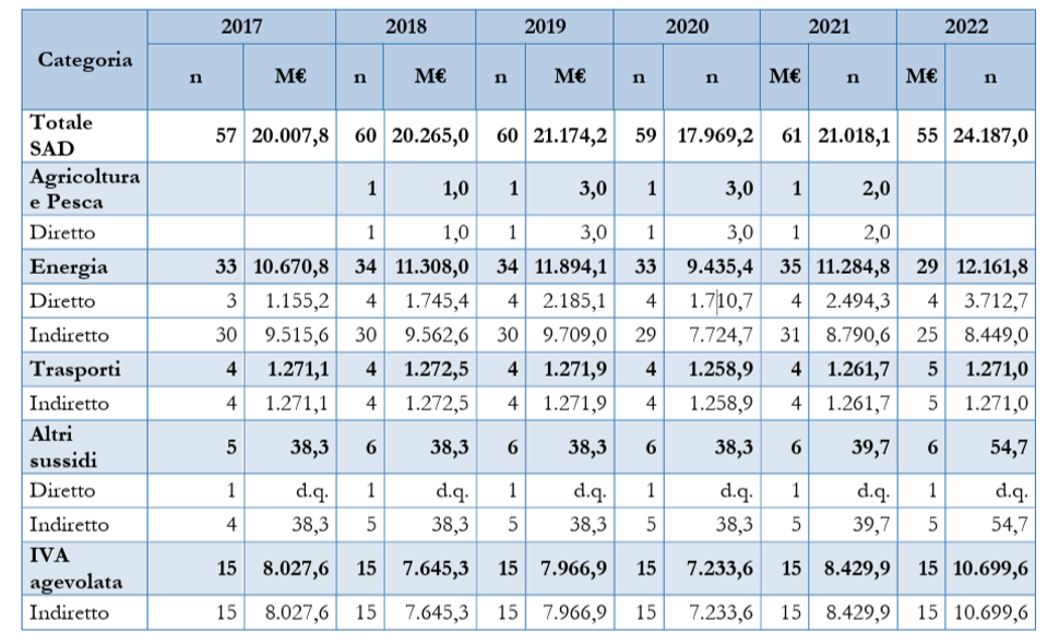 Come si nota nella prima tabella, il totale dei sussidi ambientali è costantemente in crescita dal 2017 al 2022, passando da 45,6 miliardi a 58,3. Quelli «dannosi» crescono (con la sola eccezione dell’anno Covid 2020) passando da 20 miliardi a 20,4. Quelli «favorevoli» presentano un gettito nel 2022 superiore a quello del 2017 (da 17,2 a 20,3), ma inferiore a quello del 2020 (in cui sono state importanti le misure di agevolazione). I sussidi «incerti» passano da 8,4 a 13,8 miliardi, motivo in più per chiarire rapidamente se sono dannosi o favorevoli.