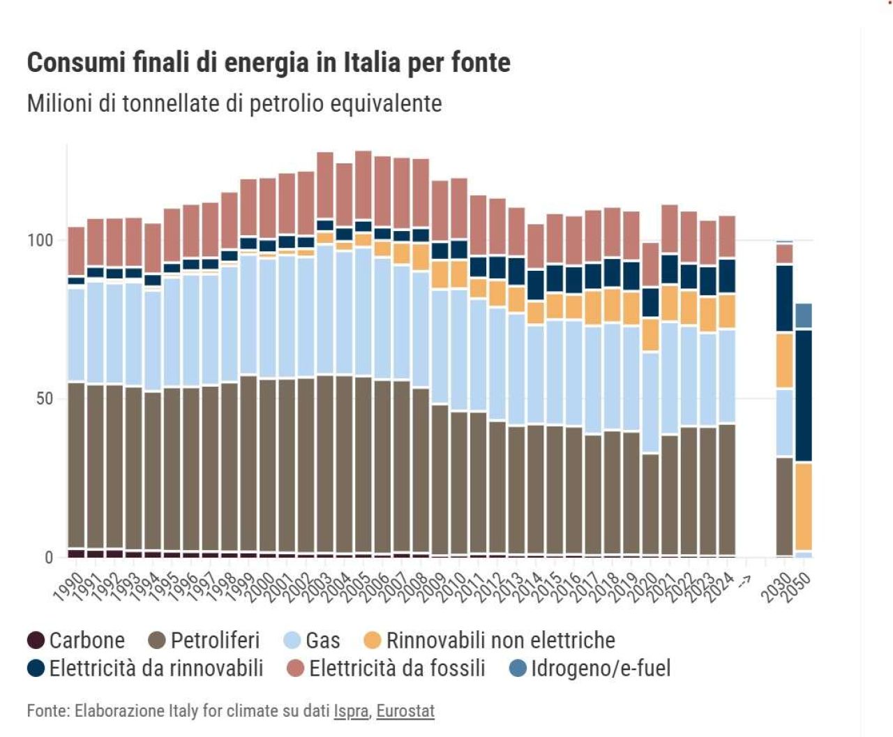 Senza accelerare su questo fronte, non solo la decarbonizzazione ma anche l’economia dell’Italia resterà indietro. Perché le rinnovabili possono fare molto bene non solo al clima ma anche al portafoglio: nell’ultimo anno i consumi energetici dell’Italia sono stati pari a 109 milioni di tonnellate equivalenti di petrolio, e per 23 di questi abbiamo potuto contare sulle rinnovabili anziché importare combustibili fossili.