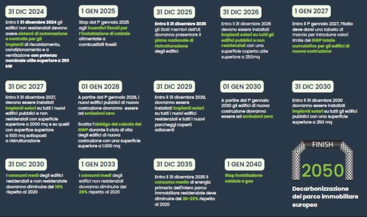 Alcune decisioni sono già previste dalla direttiva. Il 55% della riduzione dei consumi deve essere ottenuta attraverso la ristrutturazione degli edifici residenziali esistenti con peggiori prestazioni energetiche (43%). Tutti i nuovi edifici dovranno garantire emissioni zero (non dovranno quindi usare combustibili fossili, a partire dal 1° gennaio 2028 per gli edifici pubblici e dal 1° gennaio 2030 per quelli privati. Non si capisce perché attendere tutti questi anni, quando ormai le tecniche di progettazione e di realizzazione degli edifici consentono già oggi di ottenere questo risultato.