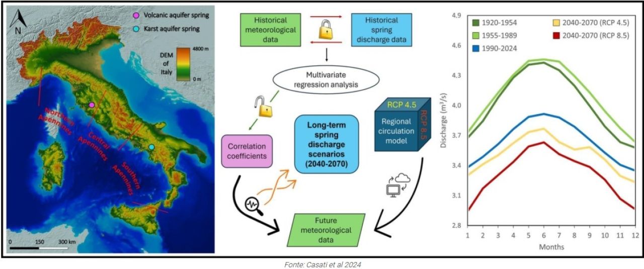 Le tendenze negative osservate nei due diversi contesti idrogeologici, si legge nello studio, suggeriscono che il declino pluridecennale della portata primaverile è più influenzato da fattori climatici che da specifiche caratteristiche idrogeologiche.