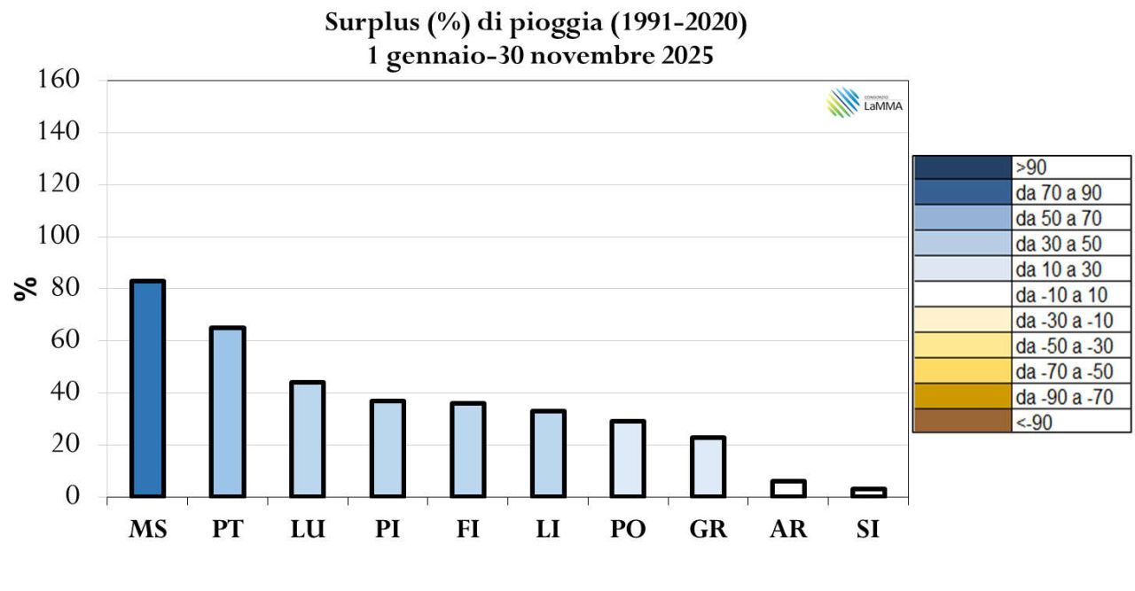 Il Laboratorio di monitoraggio e modellistica ambientale per lo sviluppo sostenibile (Lamma), consorzio pubblico nato dall’impegno congiunto di Regione Toscana e Consiglio nazionale delle ricerche (Cnr), informa che Massa-Carrara, Lucca e Pistoia fanno registrare, al 30 novembre, rispettivamente, surplus idrico di 83%, 65% e 44%. A Massa-Carrara è stato già battuto il record, con un mese di anticipo, dell'anno più piovoso dalla metà degli anni '50: siamo oggi a circa 2000 mm di pioggia caduta contro i 1838 mm dell'anno 2010.