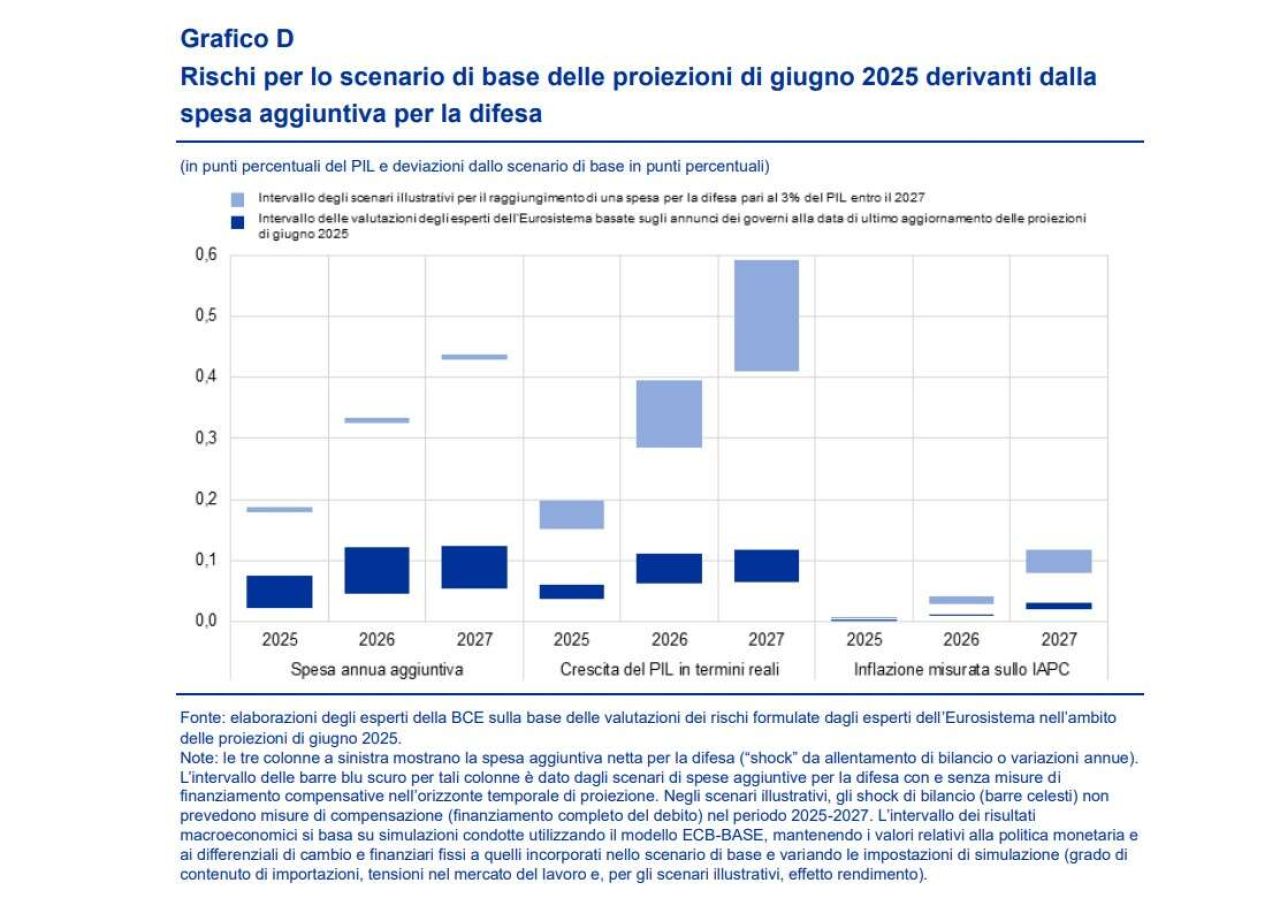 Gli scenari producono effetti sulla crescita del Pil «fino a 0,4-0,6 punti percentuali al di sopra dello scenario di base nel 2027», nonché effetti sulla crescita dell’inflazione lievemente di «circa 0,1 punti percentuali nel 2027». Tali effetti, spiega la Bce, possono essere considerati come limiti superiori per il biennio 2025-2027, in quanto «gli scenari prevedono che la spesa aggiuntiva per la difesa sia interamente finanziata mediante ricorso al debito».