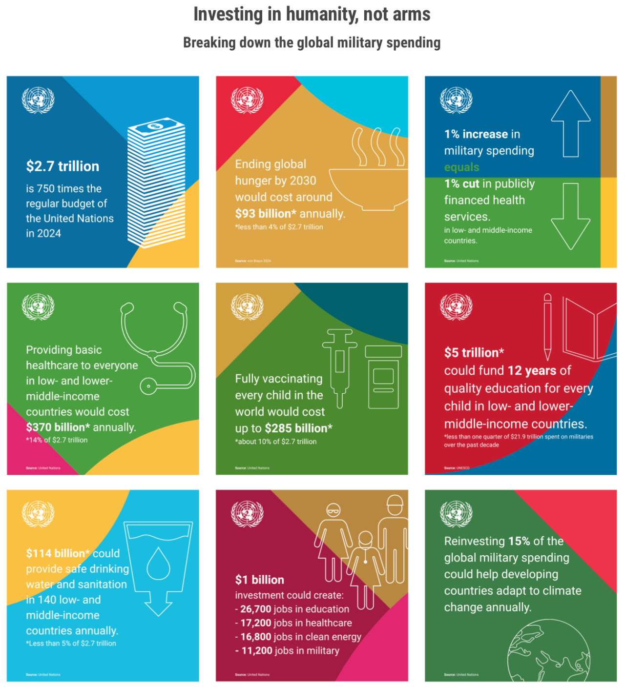 Questo fattore emerge in tutta evidenza dal lavoro svolto dalle Nazioni Unite facendo una serie di comparazioni tra la mole di dollari investita in armi, le cifre che vengono spese per migliorare la situazione delle popolazioni più in difficoltà e infine i soldi che sarebbero sufficienti per diffondere migliori condizioni di salute e benessere a livello mondiale. Qualche esempio? Meno del 4% (ovvero 93 miliardi di dollari) dei 2,7 trilioni di dollari spesi per le armi sarebbero sufficienti ogni anno per porre fine alla fame entro il 2030. Poco più del 10% (285 miliardi di dollari) consentirebbe di vaccinare completamente ogni bambino. Con 5 trilioni di dollari, il mondo potrebbe finanziare 12 anni di istruzione di qualità per ogni bambino nei paesi a basso e medio-basso reddito.