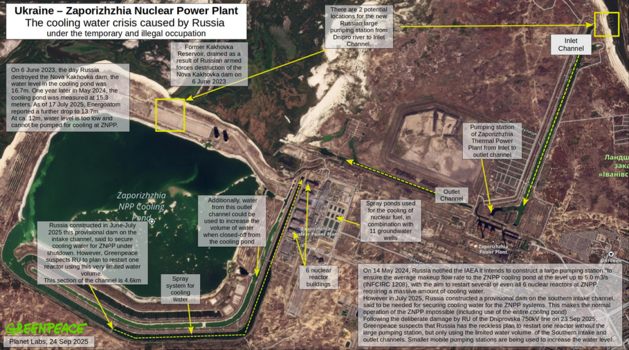 I principali sviluppi valutati nel nuovo briefing di Greenpeace sono: primo, la costruzione da parte della Russia di una nuova linea elettrica lunga 201 km tra le sottostazioni di Melitopol e Mariupol; secondo, il danneggiamento deliberato da parte della Russia della linea elettrica da 750 kV vicino alla centrale nucleare di Zaporizhzhya all'interno dell'area occupata illegalmente dalla Russia, con conseguente disconnessione completa dalla rete controllata dall'Ucraina e perdita di tutta l'alimentazione elettrica alla centrale; terzo, il completamento di un nuovo sistema di gestione dell'approvvigionamento idrico presso il bacino di raffreddamento della centrale nucleare di Zaporizhzhya; quarto, i piani di riavvio del reattore che entrano nella “fase finale” secondo la società nucleare statale russa Rostom; quinto, il ruolo conflittuale del direttore generale dell'Aiea (Agenzia internazionale per l’energia atomica) nel sostenere l'attività nucleare di Rosatom.