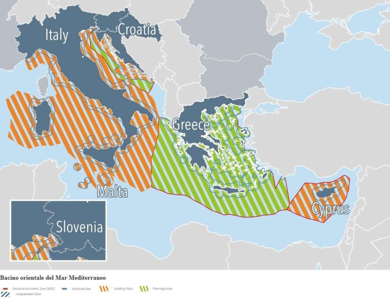 La controversia sulle acque marittime da includere nella Zee è arrivata all’Onu su formale protesta presentata dalla Turchia, che rivendica la propria posizione legale riguardo ai limiti esterni della sua piattaforma continentale nel Mediterraneo orientale. Nella cartina delle Mps relativa al Mediterraneo orientale, possiamo facilmente rilevare che la cosiddetta Zee pretesa dalla Grecia appare essere ricompresa all'interno della piattaforma continentale turca.