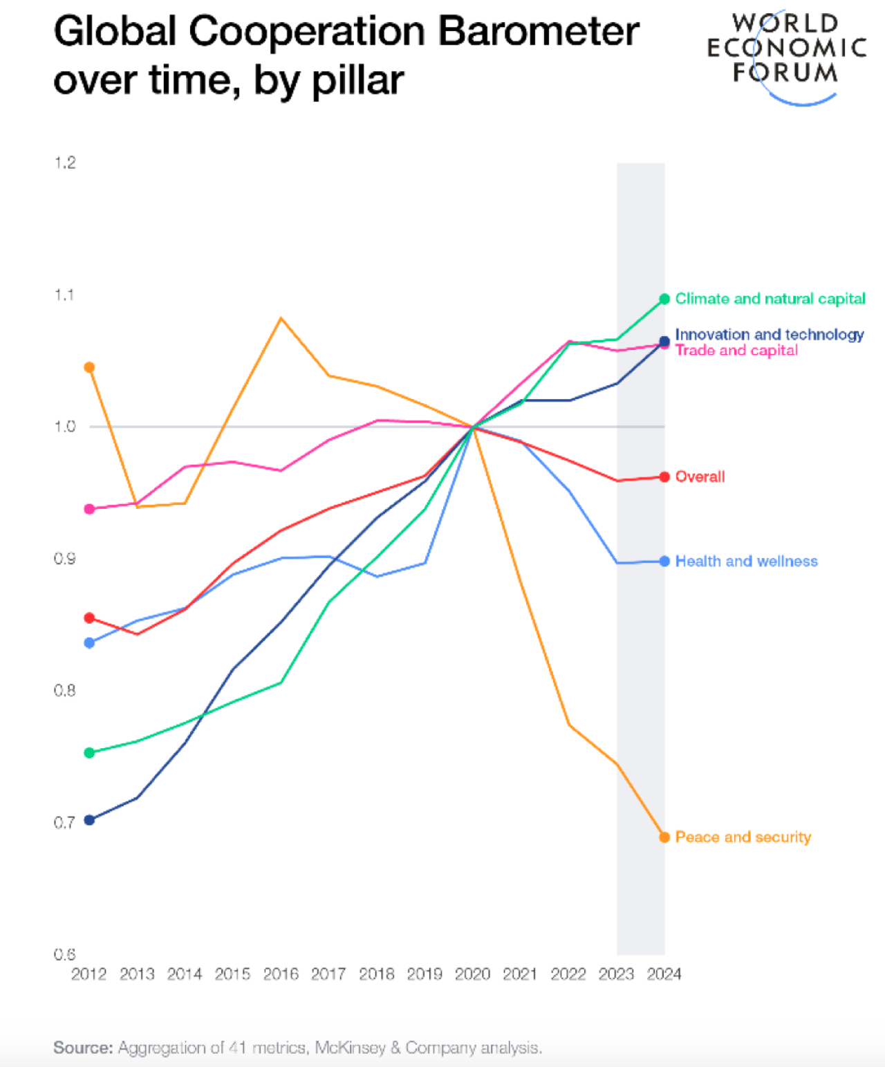 Spiega il World economic forum che sebbene forme di cooperazione multilaterale siano diminuite, coalizioni più piccole e più agili di Paesi e, a volte, di imprese, sono state determinanti per mantenere i livelli complessivi di cooperazione. E anche che il clima e la tecnologia hanno registrato un forte aumento della cooperazione anche a fronte di venti decisamente contrari (l’ultima notizia in ordine di tempo è l’uscita degli Usa dalla Convenzione quadro Onu sulla crisi climatica), la salute e il commercio sono rimasti sostanzialmente invariati, mentre la cooperazione in materia di pace e sicurezza ha subito un forte calo.