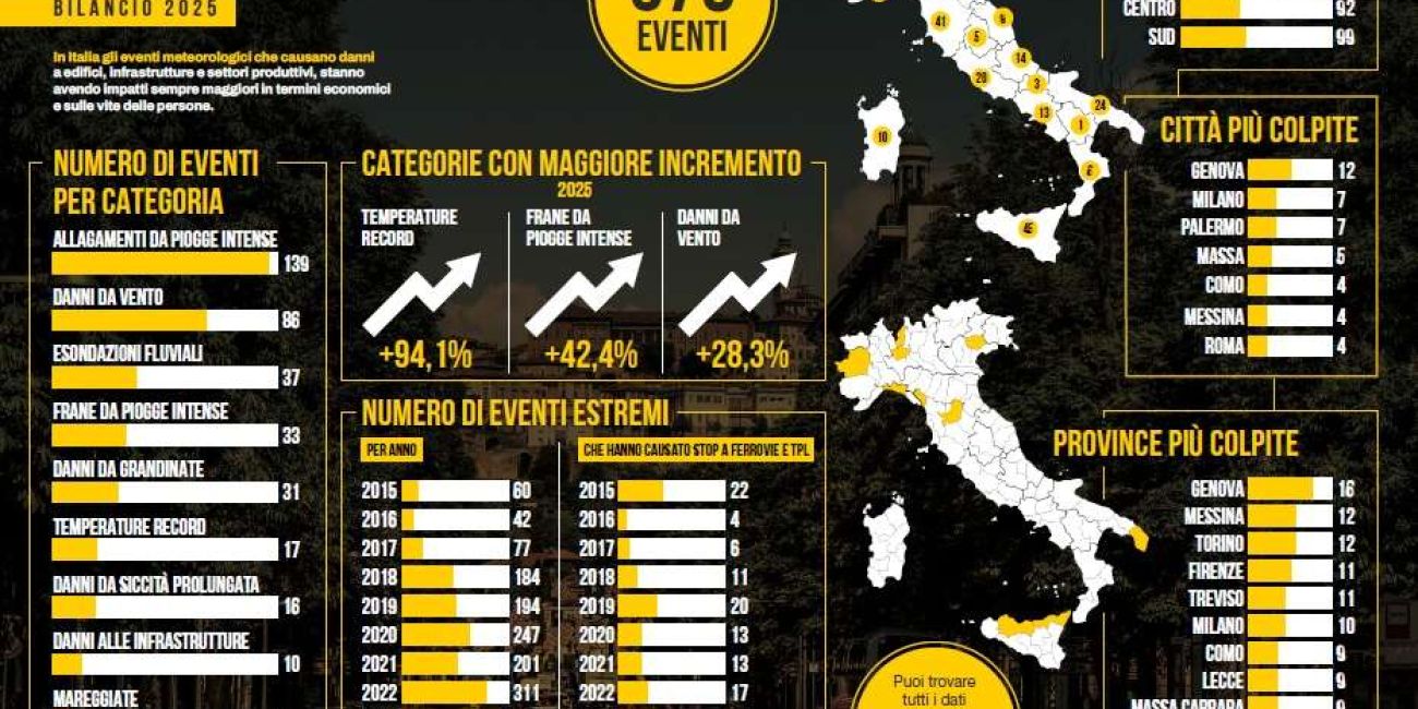 L’amaro bilancio di fine anno tracciato dell’Osservatorio Città Clima di Legambiente documenta un’Italia dove la crisi climatica continua ad accelerare indisturbata: nel 2025 gli eventi meteo estremi che hanno colpito lo Stivale sono 376, in crescita del 5,9% rispetto al 2024 e soprattutto del 526% rispetto al 2015. Il 2025 diventa così il secondo anno più intenso subito dal Paese sotto il profilo degli eventi meteo estremi, alle spalle del solo 2023 coi suoi 383 eventi estremi. Negli ultimi dodici mesi ci sono stati soprattutto allagamenti da piogge intense (139), danni da vento (86) ed eso…