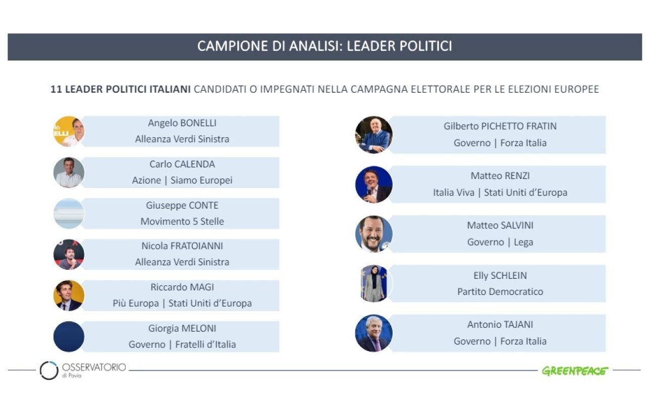 Lo studio è stato condotto analizzando le dichiarazioni dei principali leader politici italiani postate su Facebook, raccolte nelle edizioni serali dei telegiornali delle reti Rai, Mediaset e La7 e nei principali talk show politici e programmi televisivi di approfondimento nel periodo dal 1° maggio al 7 giugno. L’elenco delle figure politiche comprende: Bonelli, Calenda, Conte, Fratoianni, Magi, Meloni, Pichetto Fratin, Renzi, Salvini, Schlein e Tajani.