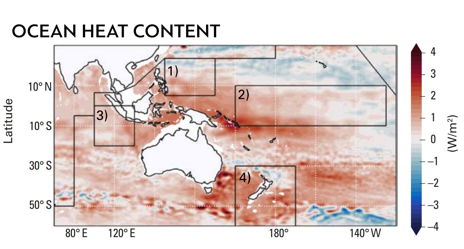 Dal 1993, la maggior parte della regione del Pacifico sud-occidentale ha sperimentato un riscaldamento dell'oceano superiore ( da 0 - 700 m di profondità) che è particolarmente forte, con tassi che superano da due a tre volte la media global,e nel Mare delle Salomone e a est delle Isole Salomone; nei mari di Arafura, Banda e Timor; a est delle Filippine; lungo la costa meridionale dell'Indonesia e nel Mar di Tasman. La Wmo fa notare che «Oltre al cambiamento climatico, il riscaldamento degli strati superiori dell'oceano nella regione è fortemente influenzato dalla variabilità naturale, ad esempio El Niño/La Niña, per cui grandi quantità di calore vengono ridistribuite dalla superficie verso gli strati più profondi dell'oceano».