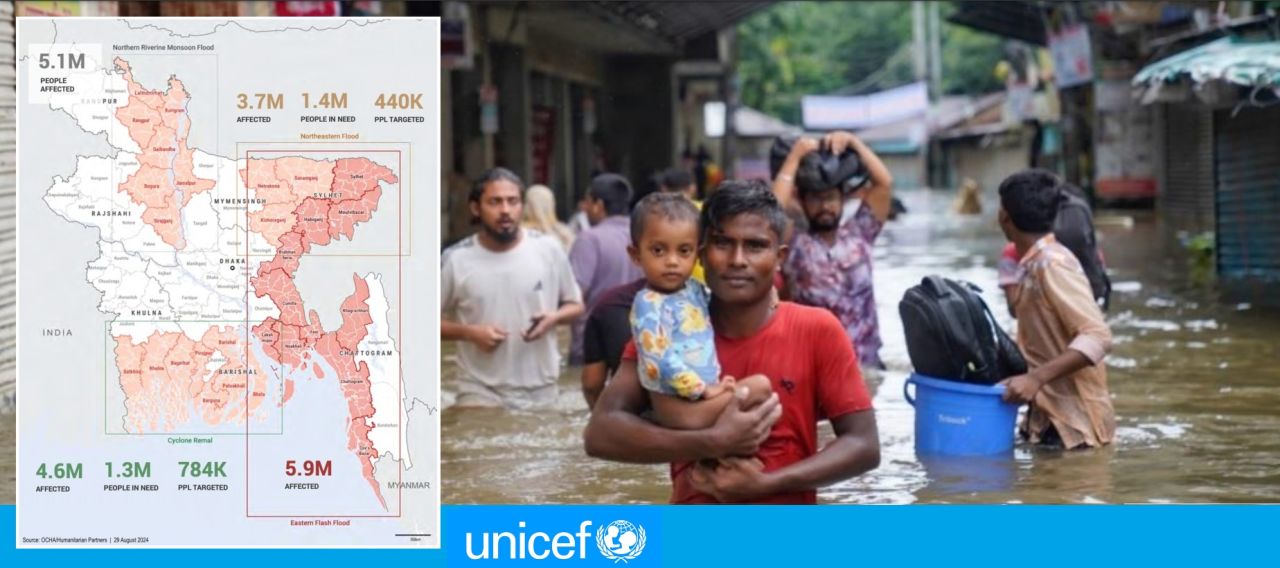 L’Unicef evidenzia che «Circa 5 milioni di persone, tra cui 2 milioni di bambini, sono state colpite, molte delle quali sono rimaste bloccate senza cibo e aiuti. Sono stati segnalati 20 decessi e 284.888 persone hanno cercato riparo in 3.527 rifugi, con operazioni di soccorso in corso da parte di personale governativo e volontari, anche se alcune aree restano inaccessibili. 1.038 team medici stanno fornendo supporto alle persone colpite, ma sono state segnalate carenze di forniture essenziali come ORS e fluidi IV a causa dell'aumento dei casi di diarrea. Oltre 7.000 istituti scolastici sono chiusi e molte scuole vengono utilizzate come rifugi o sono sommerse, con un impatto sull'istruzione dei bambini. Sono stati segnalati danni significativi ai pozzi tubolari e alle latrine, con interruzioni dell'alimentazione elettrica e delle comunicazioni stradali in diverse aree».