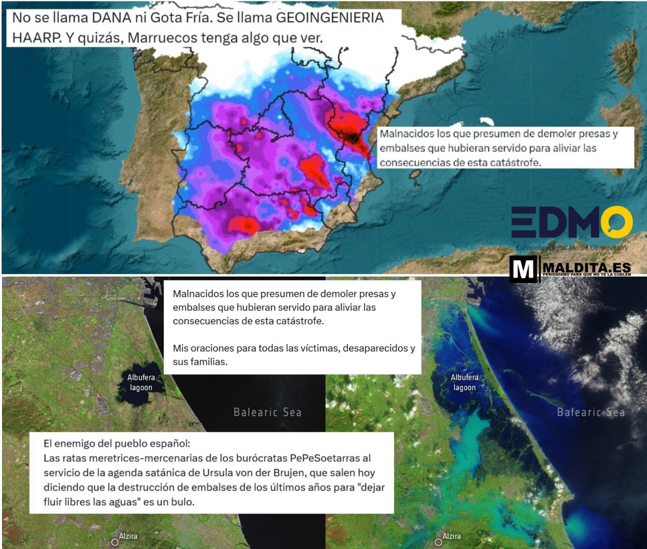 Di fronte ad un immenso disastro naturale e antropico come DANA in Spagna, emerge sempre una disinformazione che diffonde, senza prove, teorie diverse su quanto accaduto. La demolizione di dighe e paludi da parte dei governi socialisti, l'idea che l'Agencia Estatal de Meteorología spagnola (AEMET) non abbia lanciato l’allerta meteo o che il disastro climatico DANA sia il frutto di un attacco climatico del Marocco alla Spagna o del progetto HAARP, oppure abbattuto dighe e prosciugato paludi, sono le fake news che stanno diventando più virali e che vengono sparse a piene mani da politici e attivisti del Partido Popular (PP) e dall’estrema destra di Vox, alleata di Fratelli d’Italia e che ama chiudere le sue campagna elettorali con incendiari comizi di Giorgia Meloni.