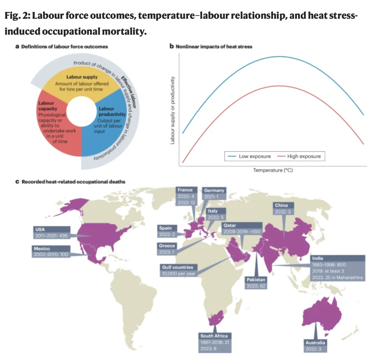 Lo stress da caldo influisce sulla salute dei lavoratori attraverso risposte fisiologiche e comportamentali, che a loro volta influiscono sul numero di ore di lavoro (offerta di manodopera), sulla produzione durante queste ore di lavoro (produttività del lavoro) e sulla capacità fisiologica di svolgere il lavoro in sicurezza (capacità lavorativa). In casi estremi, lo stress da calore può portare alla morte dei lavoratori, come dimostra il fatto che si stima che quasi 10.000 lavoratori muoiano ogni anno nei Paesi del Golfo a causa dello stress da calore. E il problema dei decessi sul lavoro legati allo stress termico è globale. Cinque lavoratori sono morti in Italia a causa degli effetti del calore nel 2022; oltre 550 lavoratori sono deceduti in Qatar tra il 2009 e il 2019; in Francia, i decessi sul lavoro legati allo stress termico sono aumentati da 4 nel 2020 a 12 nel 2022;