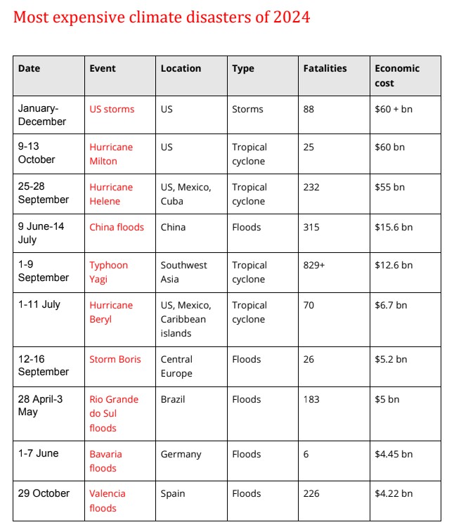 L'Europa ha rappresentato tre dei 10 disastri più costosi, con la tempesta Boris in Europa centrale e le inondazioni in Spagna e Germania che hanno causato complessivamente 13,87 miliardi di dollari di danni e 258 morti, di cui 226 nelle inondazioni di Valencia a ottobre. In Brasile, ospite del vertice sul clima COP30 nel 2025, le inondazioni nello stato di Rio Grande do Sul hanno ucciso 183 persone e causato 5 miliardi di dollari di danni.