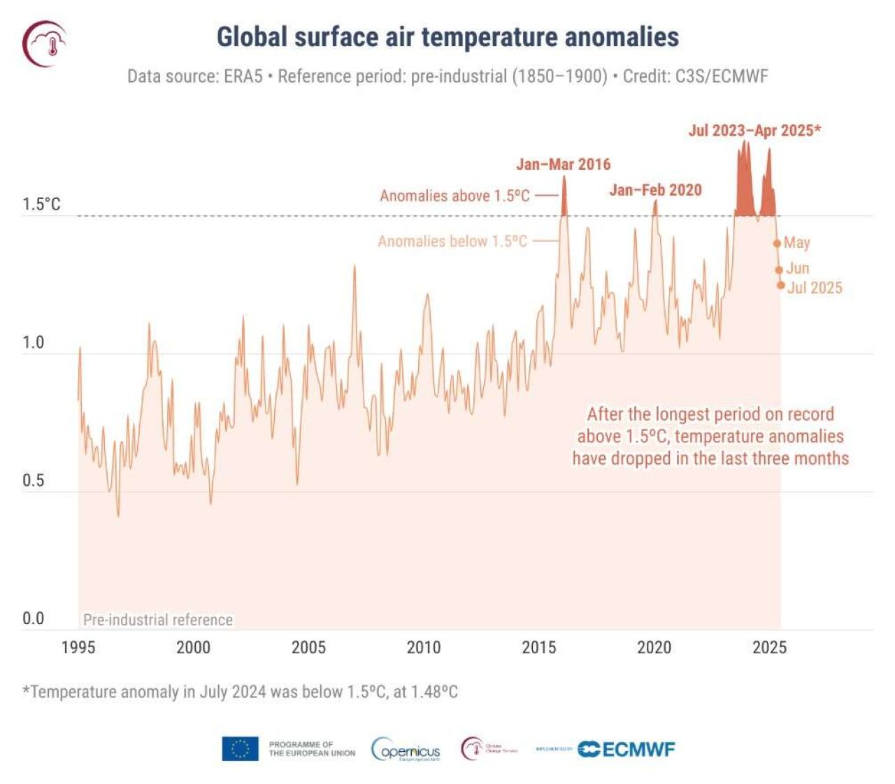 Ciò non toglie che il periodo di 12 mesi compreso tra agosto 2024 e luglio 2025 sia stato di 1.53 °C superiore al livello preindustriale, sfondando dunque il primo muro di sicurezza individuata dall’Ipcc nell’Accordo di Parigi sul clima (ovvero +1,5 °C al 2100, rispetto all’era pre-industriale); un superamento per ora “solo” temporaneo, dato che avremo definitivamente infranto questo limite quando l’anomalia di temperatura sarà oltre +1,5°C in modo “stabile”, ovvero per almeno 3-5 anni.