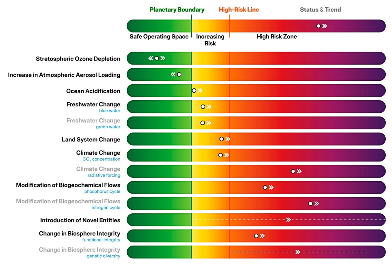 I sette limiti superati sono: cambiamento climatico, integrità della biosfera, cambiamento del sistema terrestre, uso dell'acqua dolce, flussi biogeochimici, entità nuove e acidificazione degli oceani (nuovo nel 2025). Tutti e sette questi limiti mostrano un trend in peggioramento. Solo l'esaurimento dell'ozono e il carico di aerosol rimangono nella zona di sicurezza.