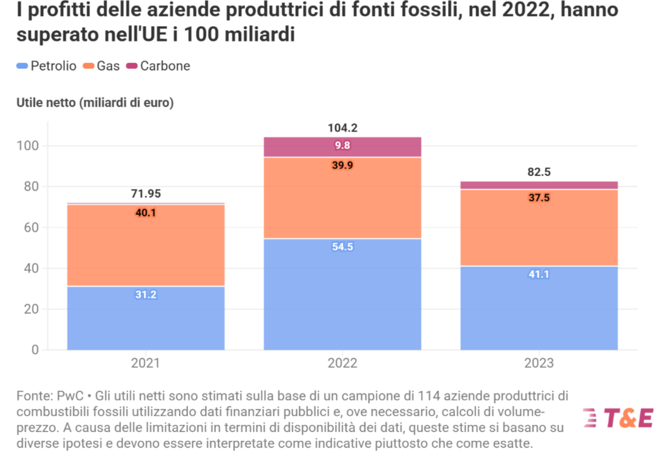 Ormai è risaputo che il prezzo dei combustibili aumenta nei periodi di instabilità. Durante i periodi di tensione o shock internazionali, gas e petrolio diventano rapidamente più cari, nonostante i costi di produzione siano relativamente stabili. Di conseguenza, i profitti delle società petrolifere e del gas possono aumentare a loro volta in modo significativo. L’analisi condotta da Pwc per conto di T&E rivela che le società petrolifere e del gas dell’Ue hanno generato oltre 104 miliardi di euro di profitti già nel 2022, con un aumento del 45% rispetto all’anno precedente. Nel 2023 hanno poi registrato un calo del 21%, ma hanno comunque superato gli 82 miliardi di euro, 11 in più rispetto al 2032.
