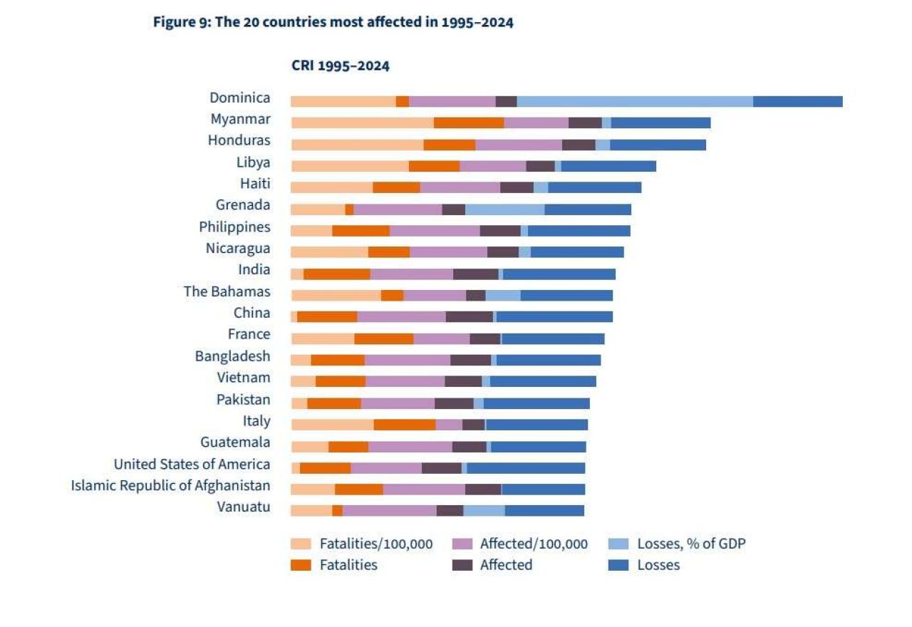 Gli impatti variano molto da Paese a Paese, ma in ogni contesto il conto più salato lo pagano le persone maggiormente vulnerabili. In cima all'indice per il periodo 1995-2024 c'è la Dominica, una piccolissima nazione insulare caraibica che è stata colpita più volte da uragani devastanti: nel 2017, il solo uragano Maria ha causato danni per 1,8 miliardi di dollari, quasi tre volte il Pil del Paese. Un altro esempio è il Myanmar, al secondo posto; nel 2008, il ciclone Nargis ha ucciso quasi 140.000 persone e ha causato danni per 5,8 miliardi di dollari.