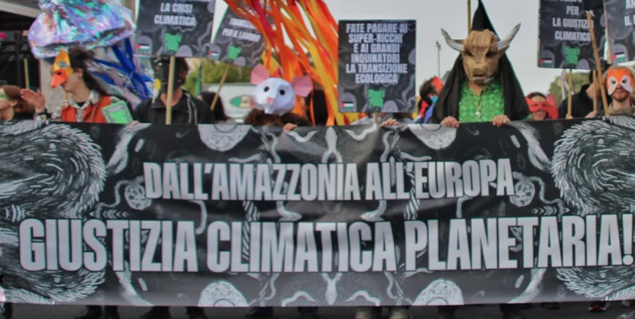 A organizzare l’appuntamento in Italia sono state 82 associazioni ambientaliste, animaliste, organizzazioni sociali, sigle del pacifismo e tante altre realtà che da tempo chiedono una giusta transizione ecologica e la fine dei conflitti armati. Per le vie della capitale ha sfilato un fiume colorato di gente, costellato di maschere di animali, “pale eoliche”, ulivi e bandiere palestinesi, migliaia di persone che hanno marciato dietro lo striscione con su scritto “Dall’Amazzonia all’Europa Giustizia Climatica Planetaria!”.