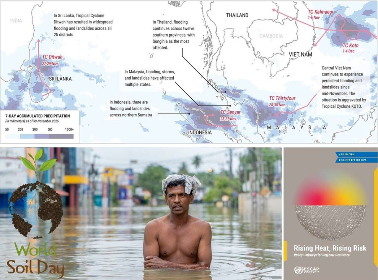 Da metà novembre, il susseguirsi e sovrapporsi di tempeste tropicali e l'intensificarsi dei sistemi monsonici hanno provocato inondazioni e frane catastrofiche in Sri Lanka, Indonesia, Thailandia, Malaysia e Vietnam. Gli esperti affermano che i disastri sono stati causati da un'insolita convergenza di potenti sistemi meteorologici, come i cicloni Ditwah e Senyar, insieme a un monsone di nord-est più forte. Le temperature elevate dell'oceano e i cambiamenti nelle traiettorie delle tempeste hanno prodotto precipitazioni estreme in aree che storicamente erano meno soggette al rischio di cicloni. In tutta la regione ci sono stati più di 1.600 morti, state colpite circa 11 milioni di persone, 1,2 milioni delle quali costrette ad abbandonare le proprie case e a rifugiarsi in rifugi, mentre strade, servizi pubblici e terreni agricoli sono stati spazzati via.