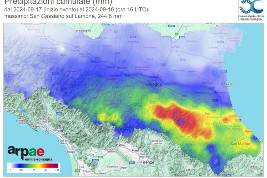 Nelle ultime 48 ore sono oltre 350 i millimetri di pioggia rovesciati dal ciclone Boris sull’Emilia-Romagna, con picchi massimi nella zona tra Ravenna e Brisighella; a confronto, nel maggio 2023 furono 400-450 i millimetri d’acqua caduta, ma in due alluvioni.