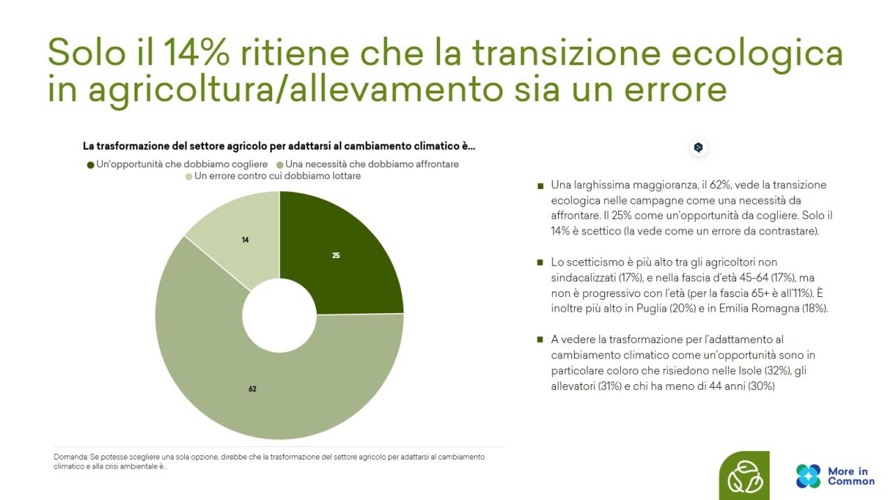 Gli agricoltori e allevatori che si ritengono molto o abbastanza preoccupati per i cambiamenti climatici sono l’82%, mentre la transizione ecologica è necessaria per il 62%, un’opportunità per il 25% e solo il 14% la considera un errore: particolarmente attenti a questi temi sono i piccoli imprenditori (che dispongono di meno di 20 ettari), gli under 45, chi risiede nelle Isole, in Campania, nel Lazio e in Toscana.