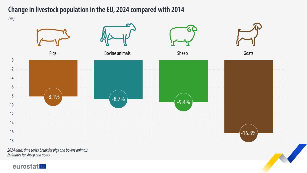 Nel 2024, l’Unione europea contava infatti 132 milioni di suini, 72 milioni di bovini, 57 milioni di ovini e 10 milioni di caprini. Rispetto all’anno precedente, tutte le popolazioni di bestiame sono diminuite: i suini hanno registrato un calo dello 0,5%, i bovini del 2,8%, gli ovini dell’1,7% e i caprini dell’1,6%.