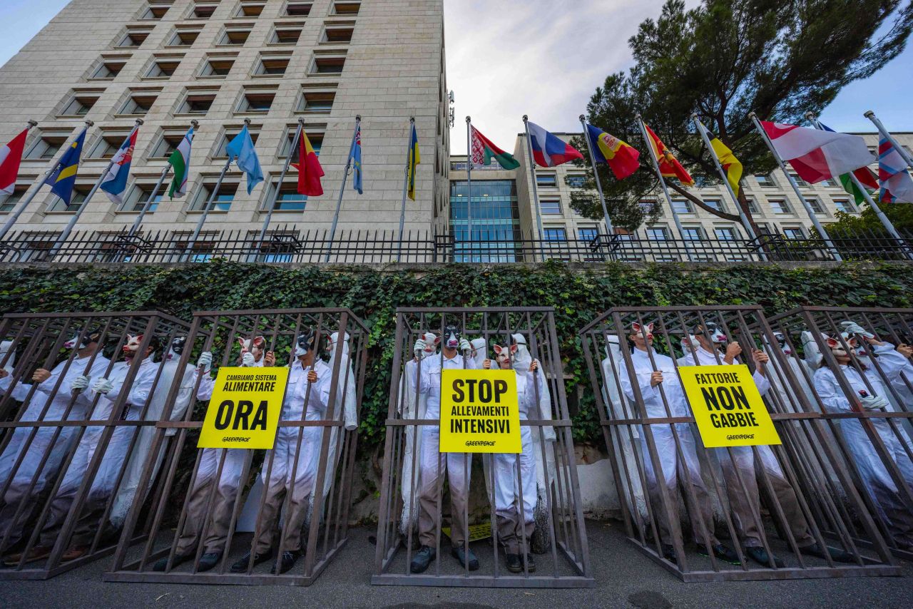 È al via a Roma – nella sede Fao – la seconda Conferenza mondiale sulla trasformazione sostenibile dell'allevamento delle Nazioni Unite, dove i delegati sono stati accolti da grandi gabbie con dentro attiviste e attivisti di Greenpeace mascherati da mucche e maiali, per denunciare l’insostenibilità dell’attuale filiera agroalimentare a partire da quella zootecnica.