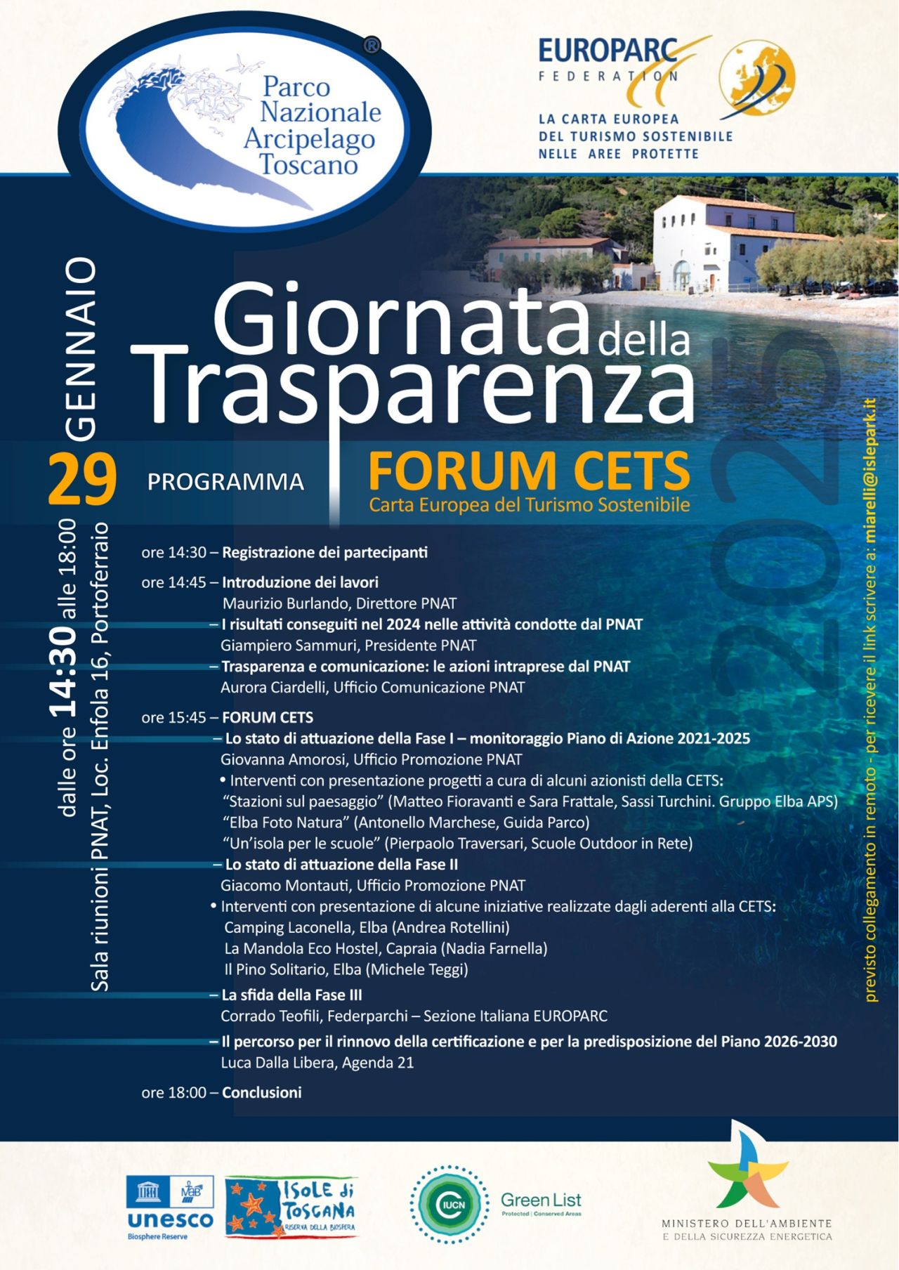 Quest’anno il Forum annuale per la Carta europea del turismo sostenibile (Cets) nelle aree protette si svolgerà in concomitanza con la Giornata della trasparenza, dando lustro a una giornata di approfondimento promossa dal Parco nazionale Arcipelago toscano (Pnat) per il prossimo 29 gennaio.