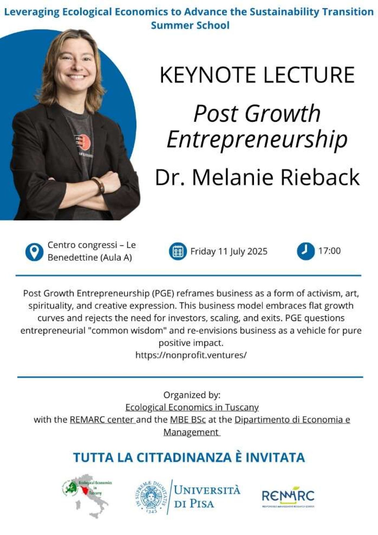 Le imprese possono contribuire alla sostenibilità senza rincorrere la crescita economica a ogni costo? È una delle domande chiave al centro dell’incontro che si terrà giovedì 11 luglio, dalle ore 17 alle 19, presso il Centro congressi “Le Benedettine” dell’Università di Pisa. L’iniziativa è promossa dal professor Tommaso Luzzati nell’ambito della summer school internazionale “Leveraging ecological economics to advance the sustainability transition”, organizzata in collaborazione con il corso di laurea in Management for Business and Economics (MBE) del Dipartimento di Economia e Management.