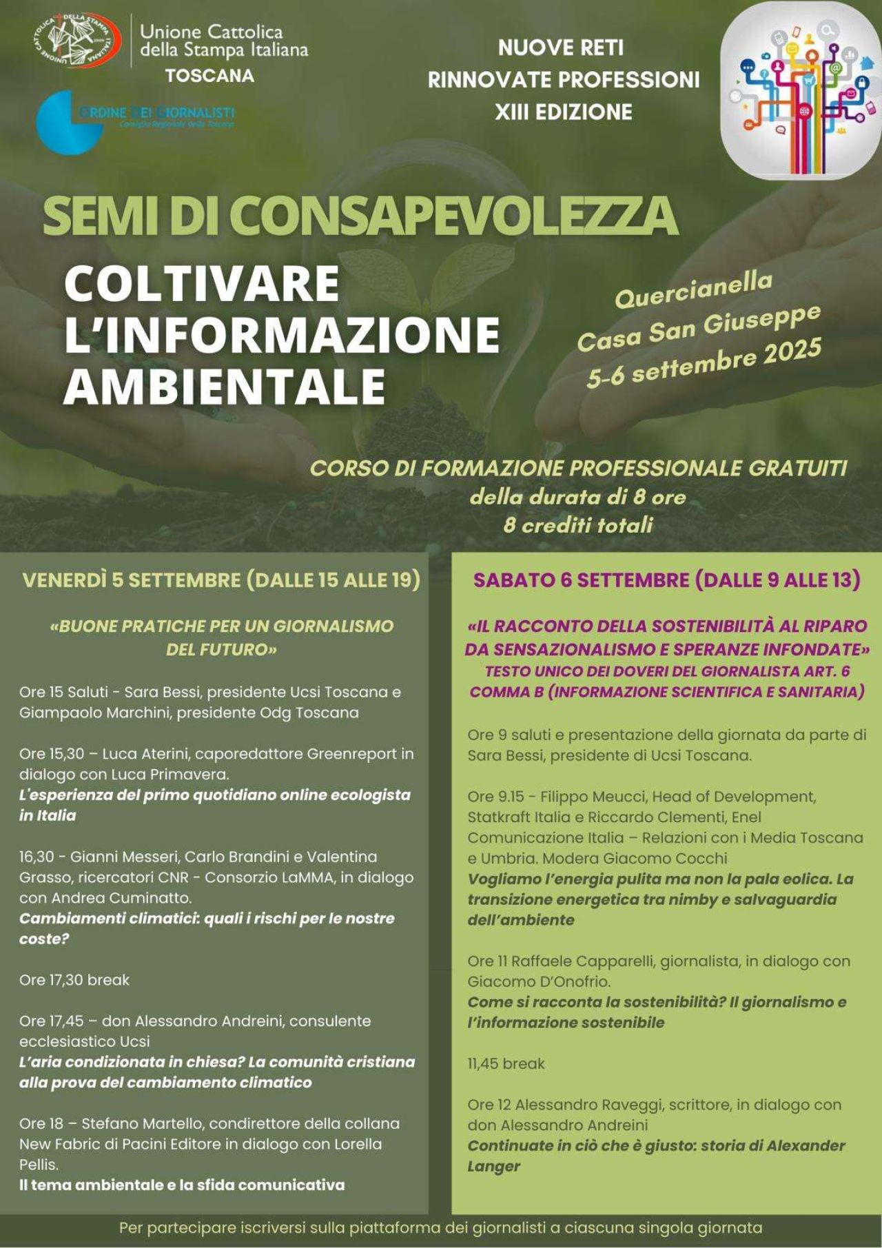 L’Unione cattolica della stampa italiana (Ucsi) e l’Ordine dei giornalisti danno appuntamento il 5 e 6 settembre alla Casa San Giuseppe di Quercianella (Livorno), con due giorni di alta formazione pensati per irrobustire le basi di un’informazione ambientale fondata su rigore scientifico, capacità comunicativa e responsabilità etica.