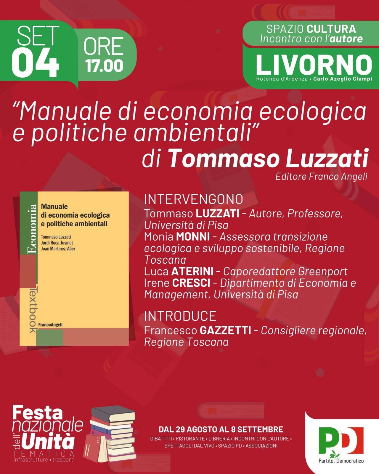 L’iniziativa voluta dal Partito Democratico ed organizzata dalla Federazione e dall’Unione Comunale di Livorno, in strettissima collaborazione con i livelli nazionale e regionale, vede svolgersi oltre 30 dibattiti pubblici con più di 150 ospiti, tra i quali spicca – domani giovedì 4 settembre, alle ore 17 – la presentazione del nuovo Manuale di economia ecologica e politiche ambientali (Franco Angeli), un testo didattico di livello universitario curato dall’economista dell’Università di Pisa Tommaso Luzzati insieme a Jordi Roca Jusmet e Joan Martinez-Alier, con la prefazione affidata all’economista ambientale Massimiliano Mazzanti.