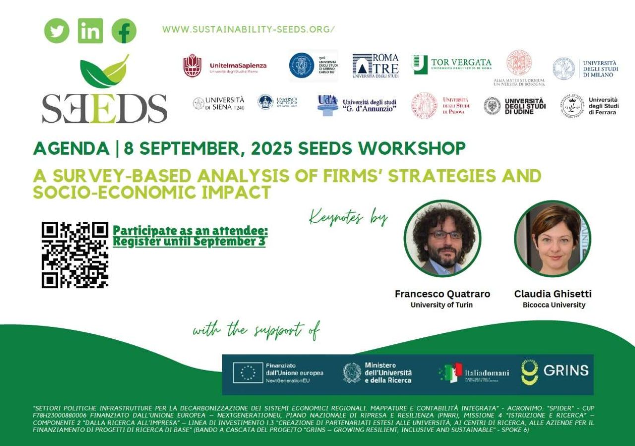 Ad aprire i lavori di entrambe le giornate saranno i saluti del direttore di Dipartimento e coordinatore Seeds, l’economista ambientale Massimiliano Mazzanti. L’8 settembre i keynote sono affidati a Francesco Quatraro (Università di Torino), che presenterà gli usi delle survey per mappare le dinamiche d’innovazione circolare (Grins Ce Survey), e a Claudia Ghisetti (Università Bicocca), con una lettura su due decenni di misurazioni dell’eco-innovazione basate su dati d’indagine.