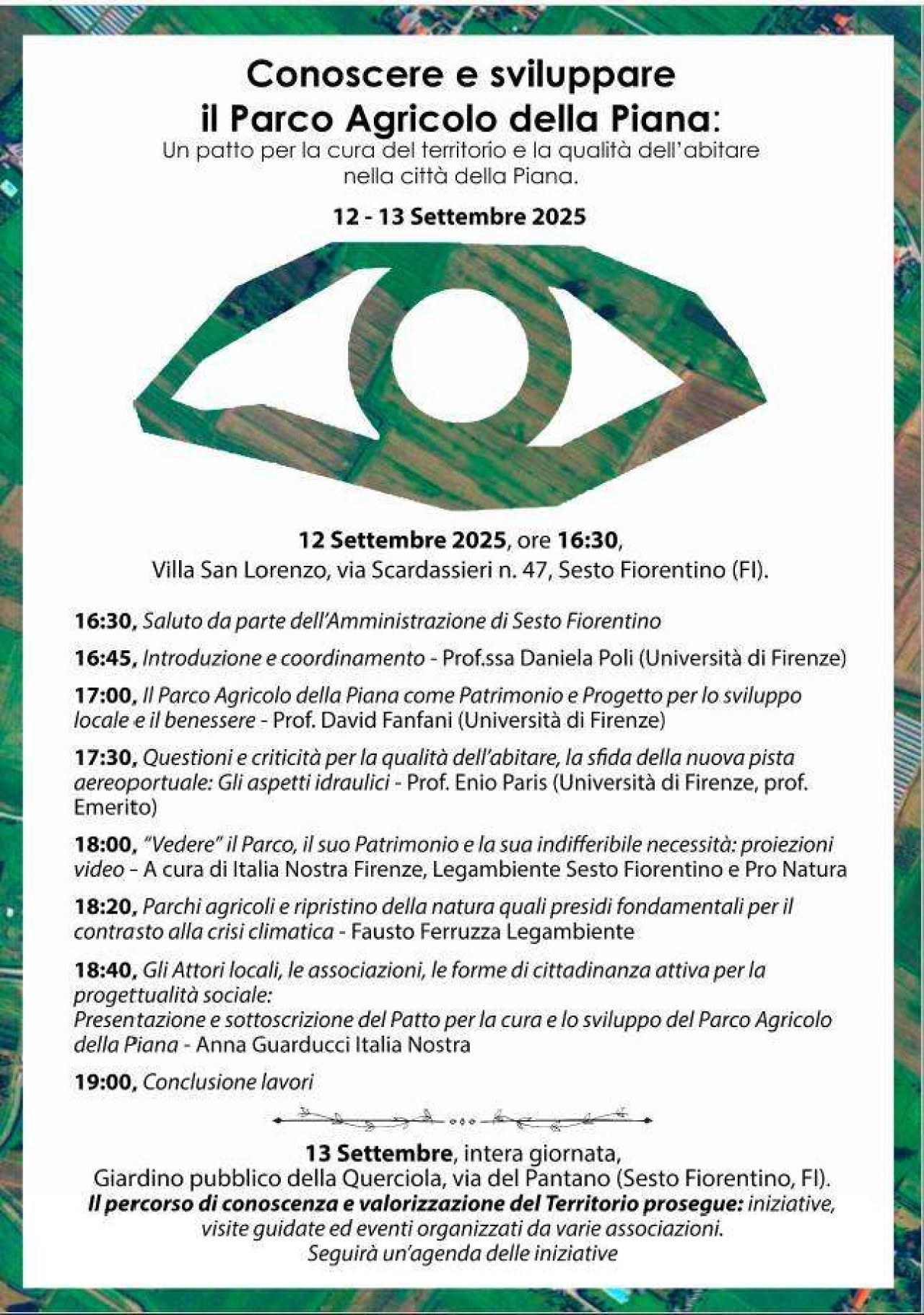 Il patto per la cura e la tutela del Parco Agricolo della Piana verrà presentato e sottoscritto il giorno venerdì 12 settembre alle ore 16.30, a Villa San Lorenzo (via Scardassieri 47, Sesto Fiorentino). Il convegno proseguirà dalle ore 16.30 alle 19.00 con interventi di rappresentanti dell'amministrazione di Sesto Fiorentino, dell'Università di Firenze e di associazioni come Legambiente, Italia Nostra, VAS e Pronatura per parlare del progetto del Parco Agricolo della Piana. I temi al centro del convegno saranno lo sviluppo del progetto territoriale, i benefici per l'ambiente e per il contrasto alla crisi climatica e il rischio invece rappresentato dal nuovo masterplan dell'Aeroporto di Firenze.