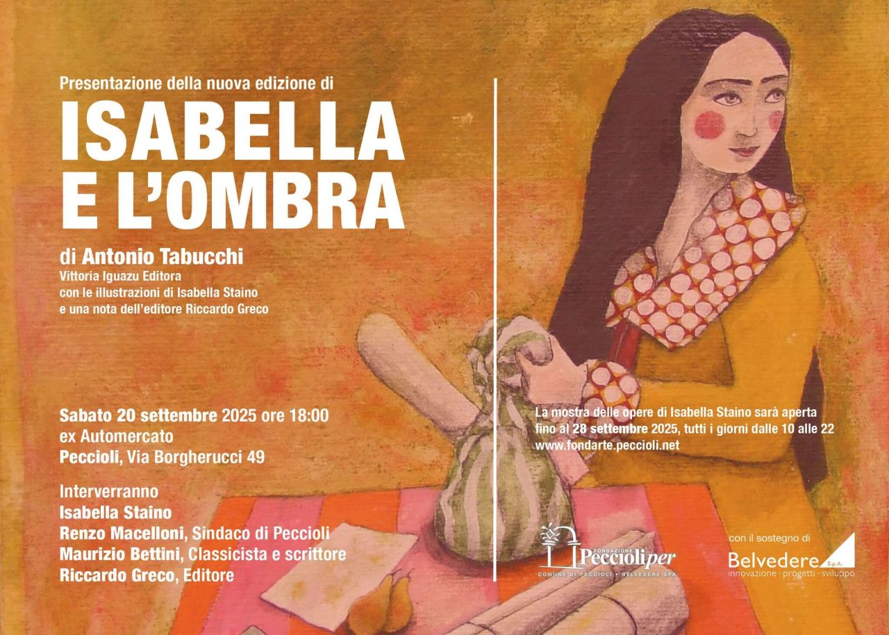 Proprio in questo contesto, sabato 20 settembre 2025 alle ore 18:00, verrà presentata la nuova edizione di Isabella e l’ombra (Vittoria Iguazu Editora), il racconto di Antonio Tabucchi illustrato da Isabella Staino, con una nota dell’editore Riccardo Greco. La storia, dedicata a bambini dai 4 anni in su, racconta di Isabella, una bambina che percepisce e interpreta il mondo attraverso i colori, suscitando stupore nella sua maestra e trasformando i “pensierini” scolastici in autentici disegni ricchi di immaginazione.