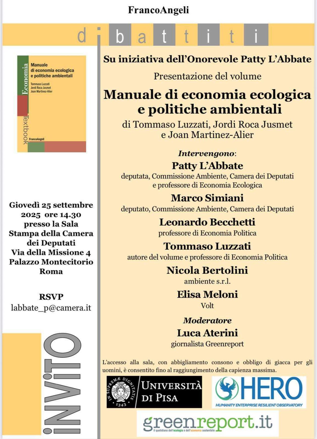 L’appuntamento è organizzato su iniziativa di Patty L’Abbate (economista ecologica e vicepresidente della commissione Ambiente della Camera, espressa dal M5S), che parteciperà al tavolo di confronto insieme a Luzzati, Marco Simiani (capogruppo Pd in commissione Ambiente), Leonardo Becchetti (professore di Economia politica all’Università di Roma Tor Vergata), Nicola Bertolini (dirigente Ambiente srl) ed Elisa Meloni (economista ecologica ed esponente del partito paneuropeo Volt), con la moderazione del caporedattore di greenreport Luca Aterini. L'accesso alla presentazione è libero, previo accredito scrivendo all'indirizzo email