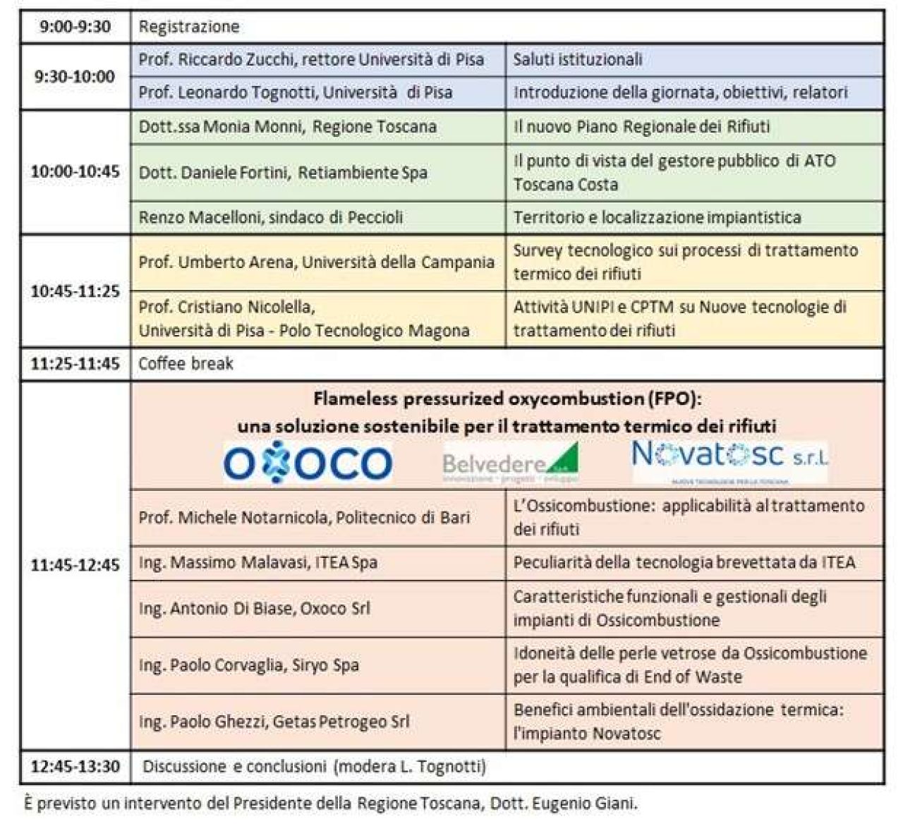 L’input all’organizzazione del workshop è stato fornito dalla società Novatosc di Peccioli, che ha proposto di condividere con la comunità scientifica il proprio progetto di ossicombustione, attualmente sottoposto alla valutazione dell’Autorità Competente. Tale proposta viene inserita in un quadro più ampio di analisi e confronto sulle diverse tecnologie emergenti nel campo del recupero di materia ed energia dai rifiuti.