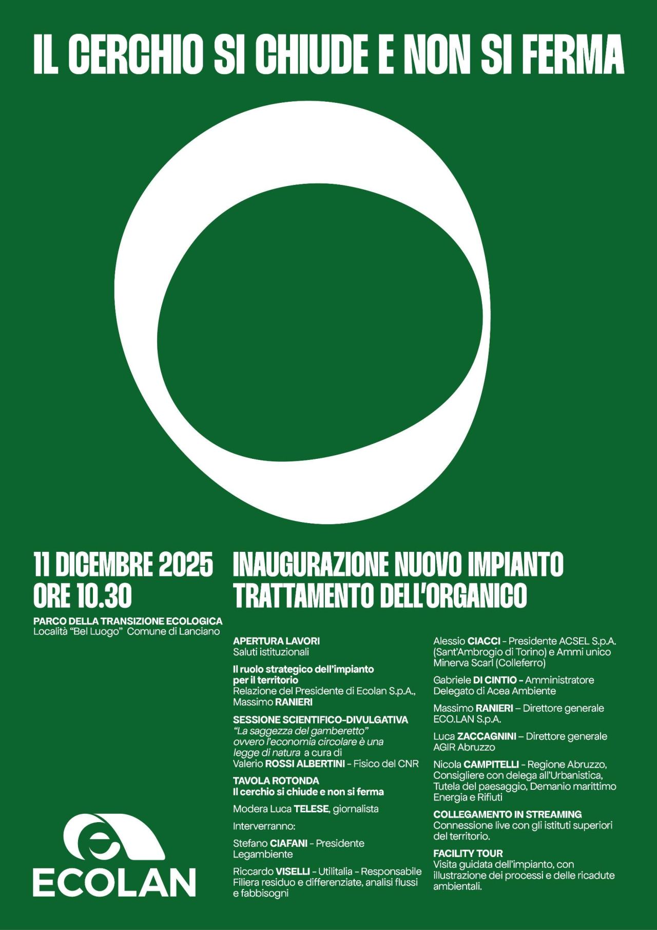L’appuntamento è alle 10.30 del prossimo 11 dicembre, quando oltre ai dirigenti Ecolan interverranno rappresentanti di Cnr, Legambiente, Utilitalia, Acsel, Acea Ambiente, Agir Abruzzo; a seguire è previsto un tour guidato dell’impianto, che si presenta come particolarmente innovativo.