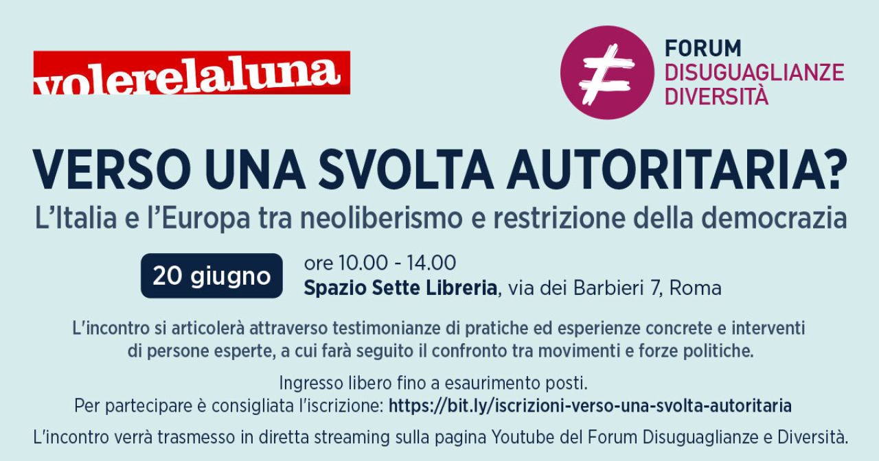 Giovedì 20 giugno, dalle 10:00 alle 14:00, presso la sala di Spazio Sette Libreria, in via dei Barbieri 7 a Roma, si terrà l’incontro “Verso una svolta autoritaria? L’Italia e l’Europa tra neoliberismo e restrizione della democrazia”, organizzato dal Forum Disuguaglianze e Diversità e dall’associazione Volere La Luna.