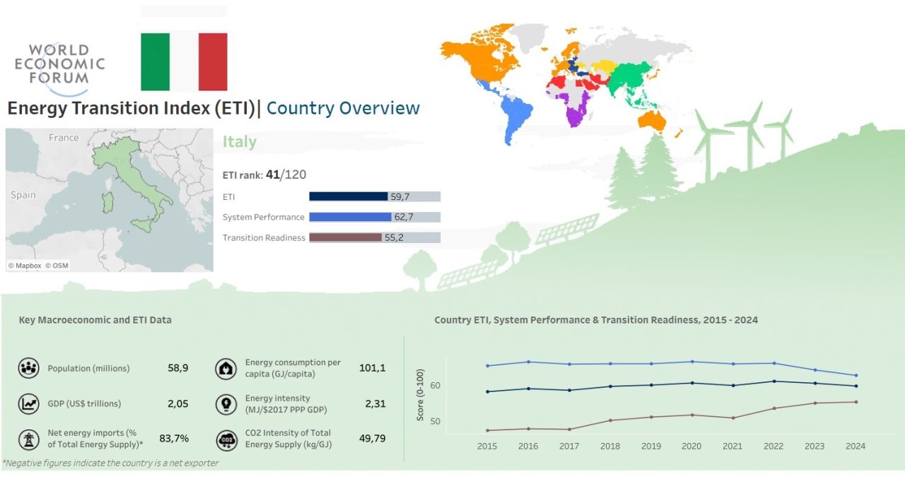 IL rapporto utilizza l’Energy Transition Index (ETI) per valutare 120 Paesi in base alle prestazioni dei loro attuali sistemi energetici, con particolare attenzione all’equilibrio tra equità, sostenibilità ambientale e sicurezza energetica, e alla loro preparazione alla transizione. L’Italia ne esce malissimo, con una delle peggiori performance dei Paesi europei e sviluppati, al 41esimo posto con un ETI del 59,7, una System Performance del 62, 7 e una Transition Readiness del 55,2.