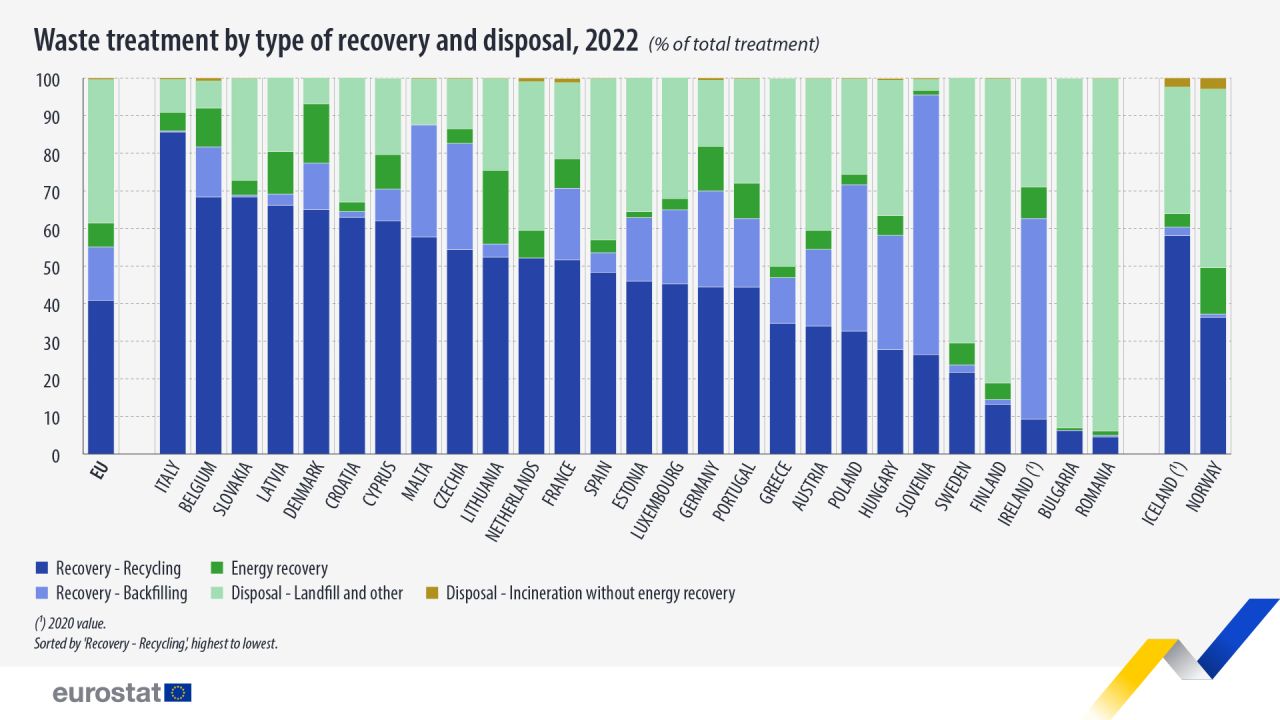 Si tratta di una performance che raggiunge però valori molto diversi tra i vari Paesi europei, con lo smaltimento che ancora domina le modalità di gestione rifiuti in Romania (93,8%), Bulgaria (93%) e Finlandia (81%), mentre la quota più alta di riciclo viene riconosciuta all’Italia (85,6%), seguita da Belgio e Slovacchia (entrambi al 68,3%).
