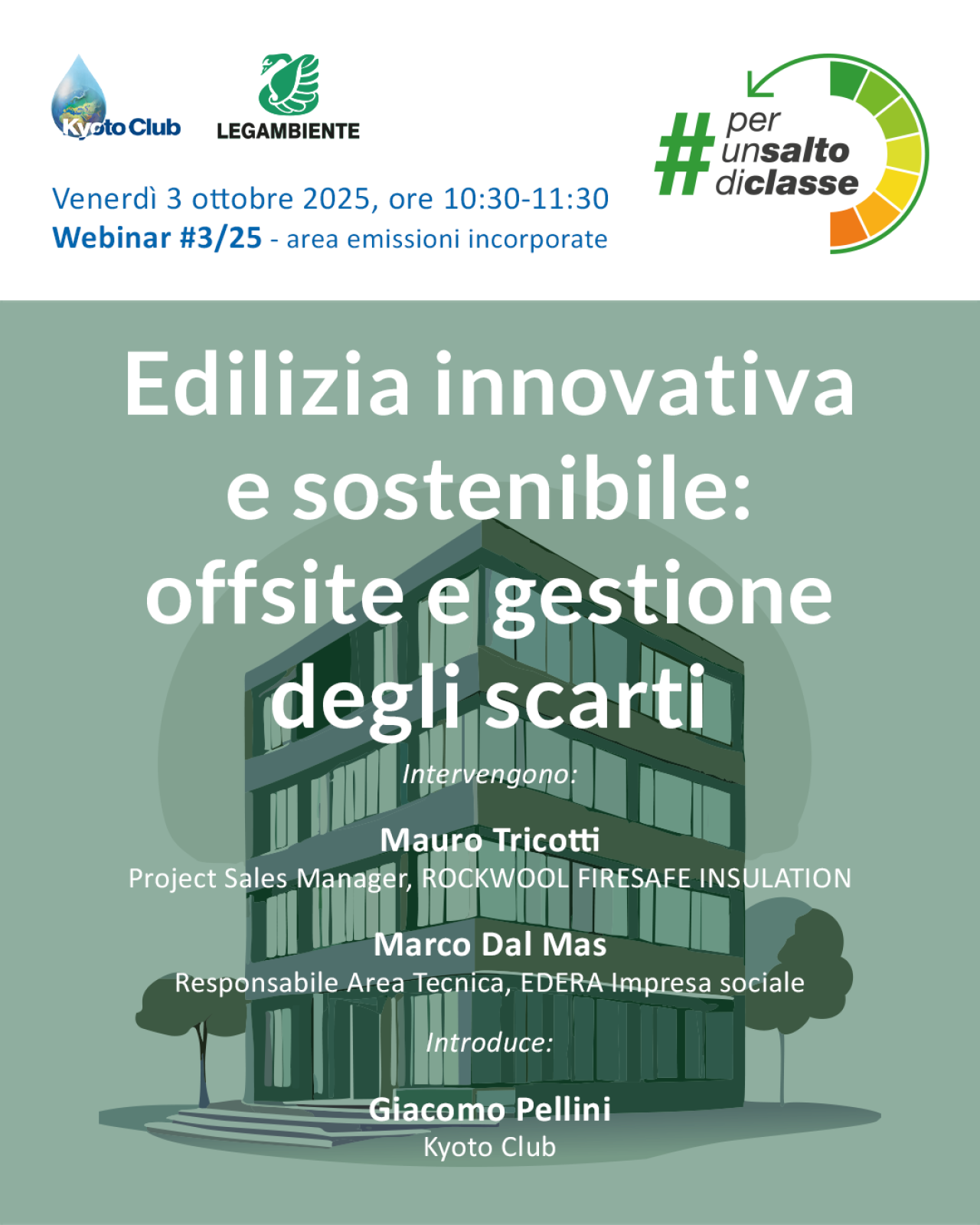 Per approfondire queste sfide, Kyoto Club e Legambiente organizzano il webinar “Edilizia innovativa e sostenibile: offsite e gestione degli scarti”, che si terrà venerdì 3 ottobre 2025, dalle 10:30 alle 11:30, nell’ambito del ciclo di incontri #PerUnSaltodiClasse dedicati all’efficienza e alla decarbonizzazione del patrimonio edilizio.