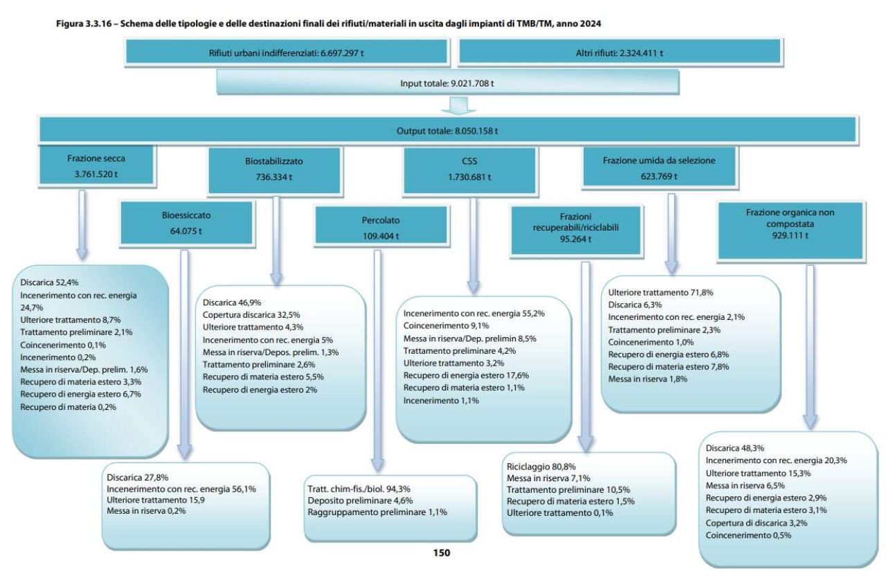 Nel 2024 i rifiuti avviati al trattamento meccanico biologico (TMB) o al solo trattamento meccanico (TM) sono pari a 9 milioni di tonnellate; tale processo intermedio è effettuato presso 132 impianti che producono circa 8 milioni di tonnellate di rifiuti destinati ad altre tipologie di trattamento.